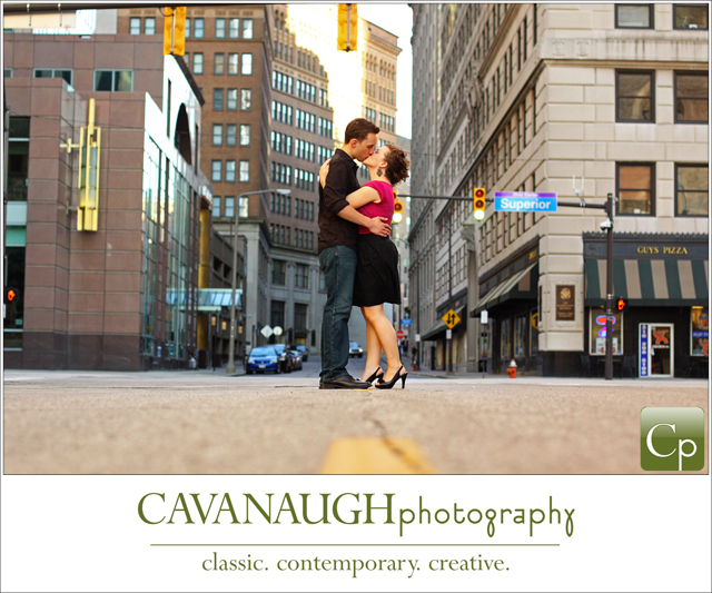 I took this photo of Danielle and Ken during their engagement session in Downtown Cleveland. After having to reschedule once due to rain we were so glad to have perfect weather Wednesday evening for their shoot. Danielle and Ken were adventurous enough to let me take this photo of them standing in the middle of the street, Then again, I was sitting in the middle of the street. Not wise, but so worth it! :)
